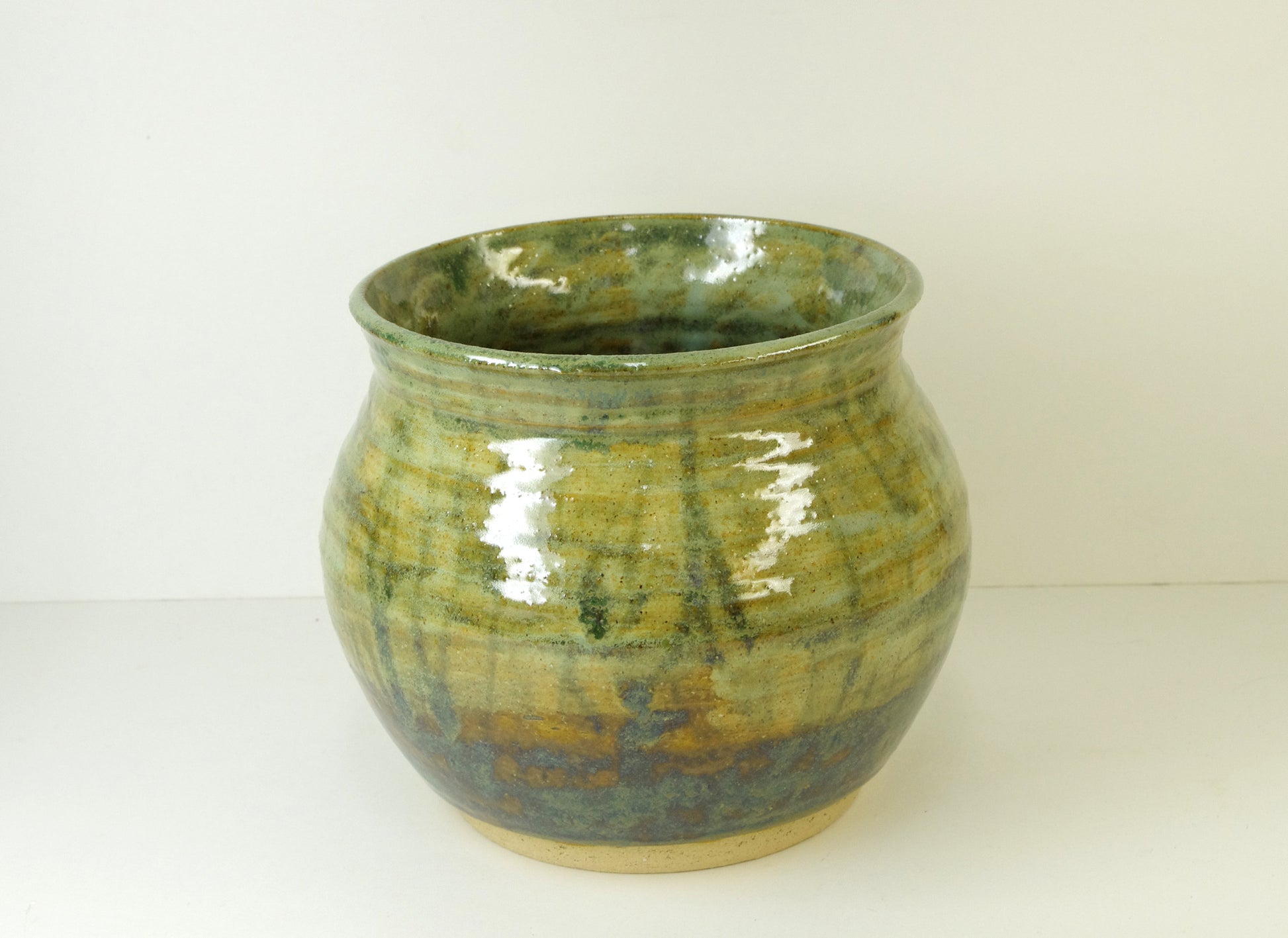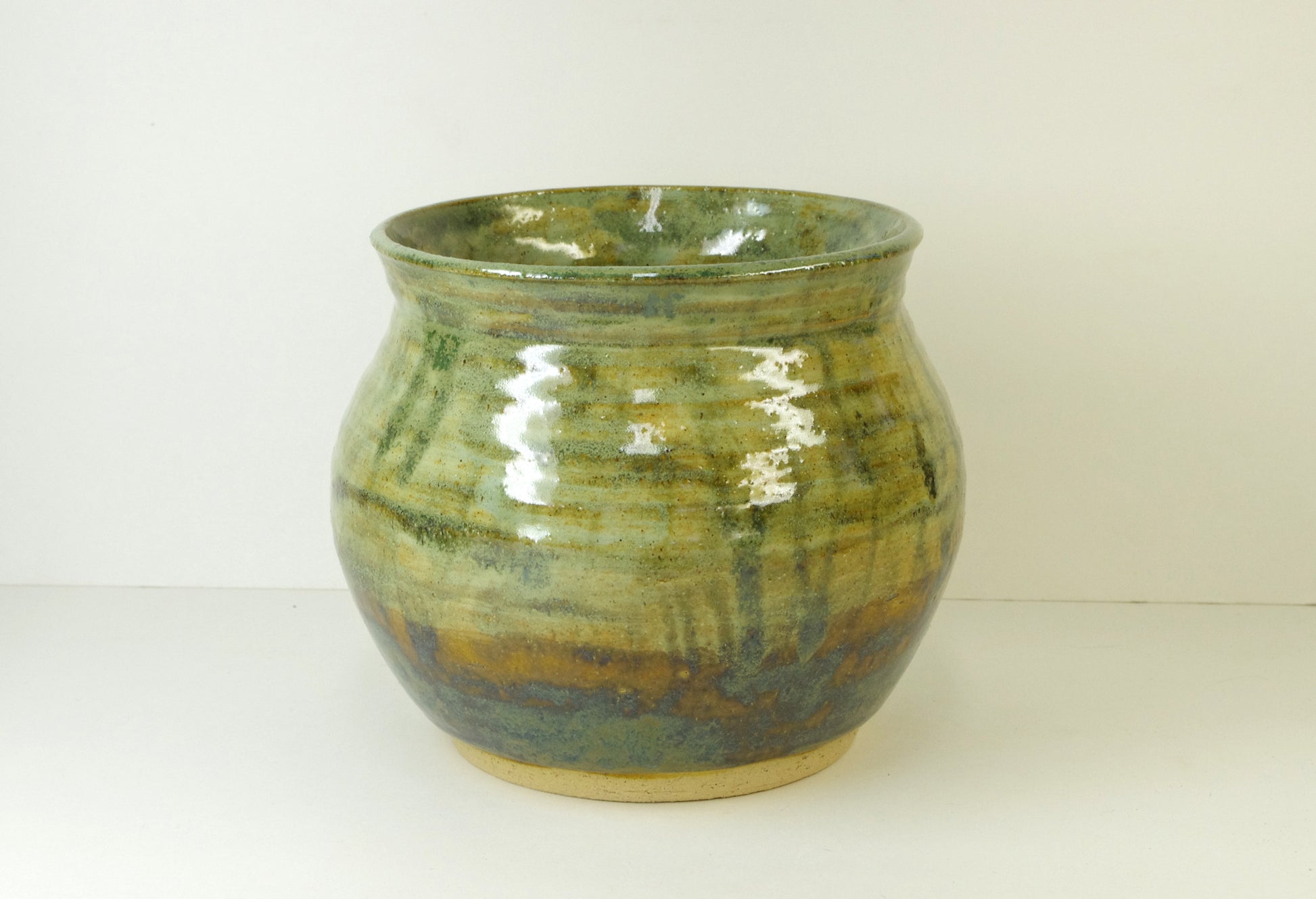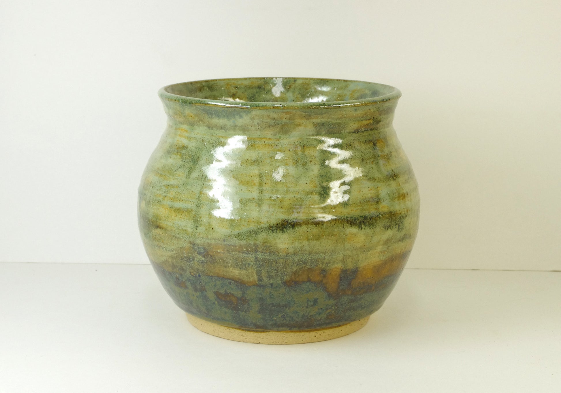 The Vase is heavy and has a gloss glaze of light, medium and dark greens, medium golden-browns, and some blues.