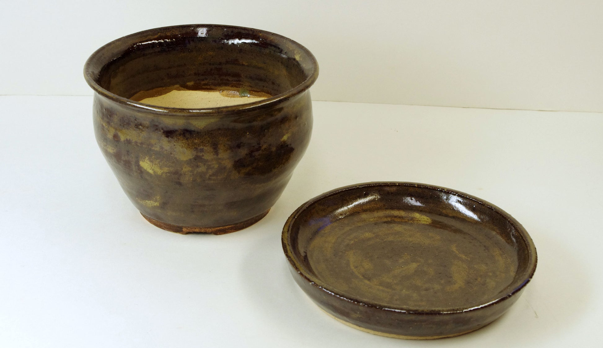 Item 2096, Hand Thrown Stoneware Flower Pot Planter and Saucer, Browns