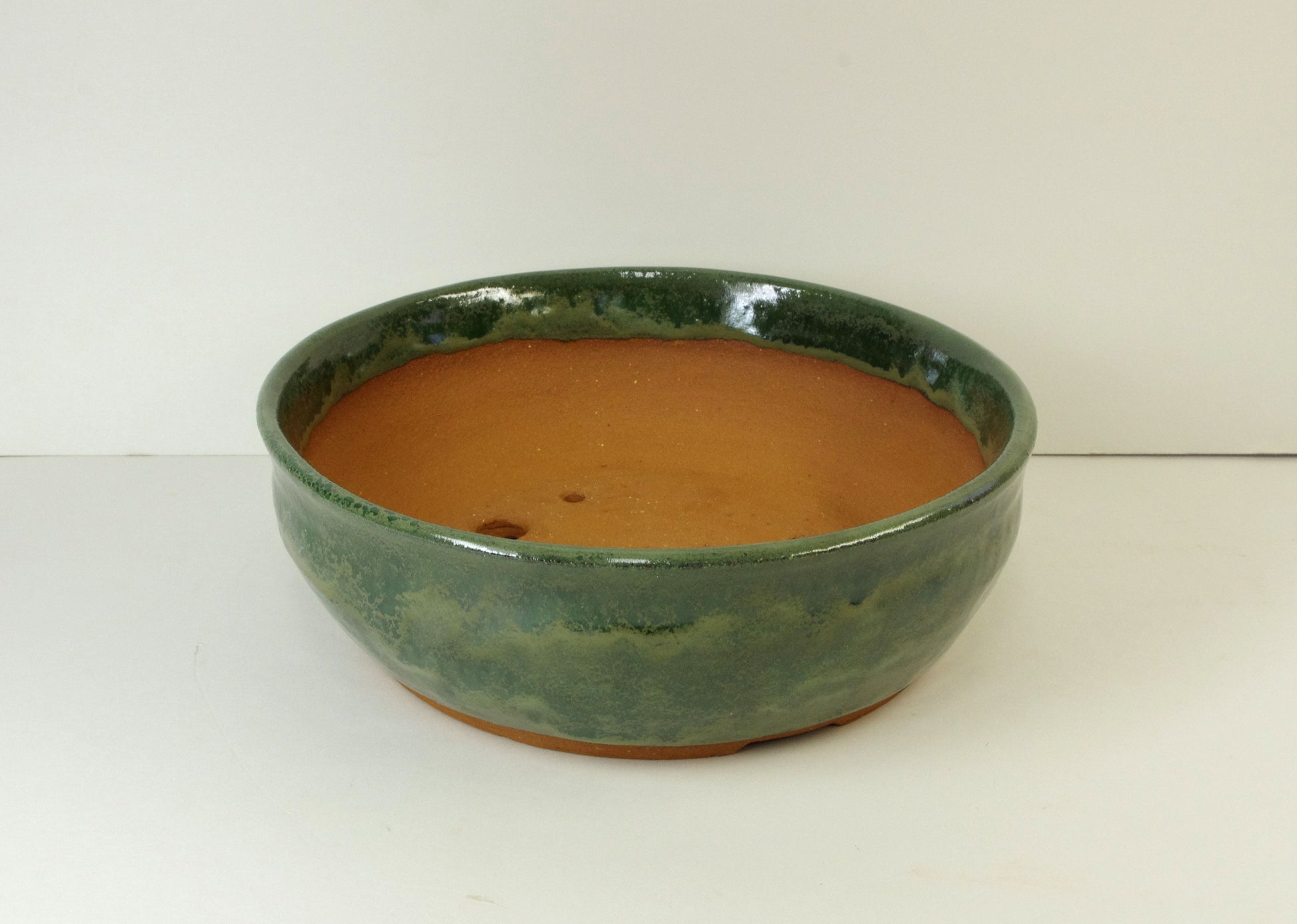Hand Thrown Stoneware Bonsai Pot, with a gloss glaze of light, medium and dark greens.