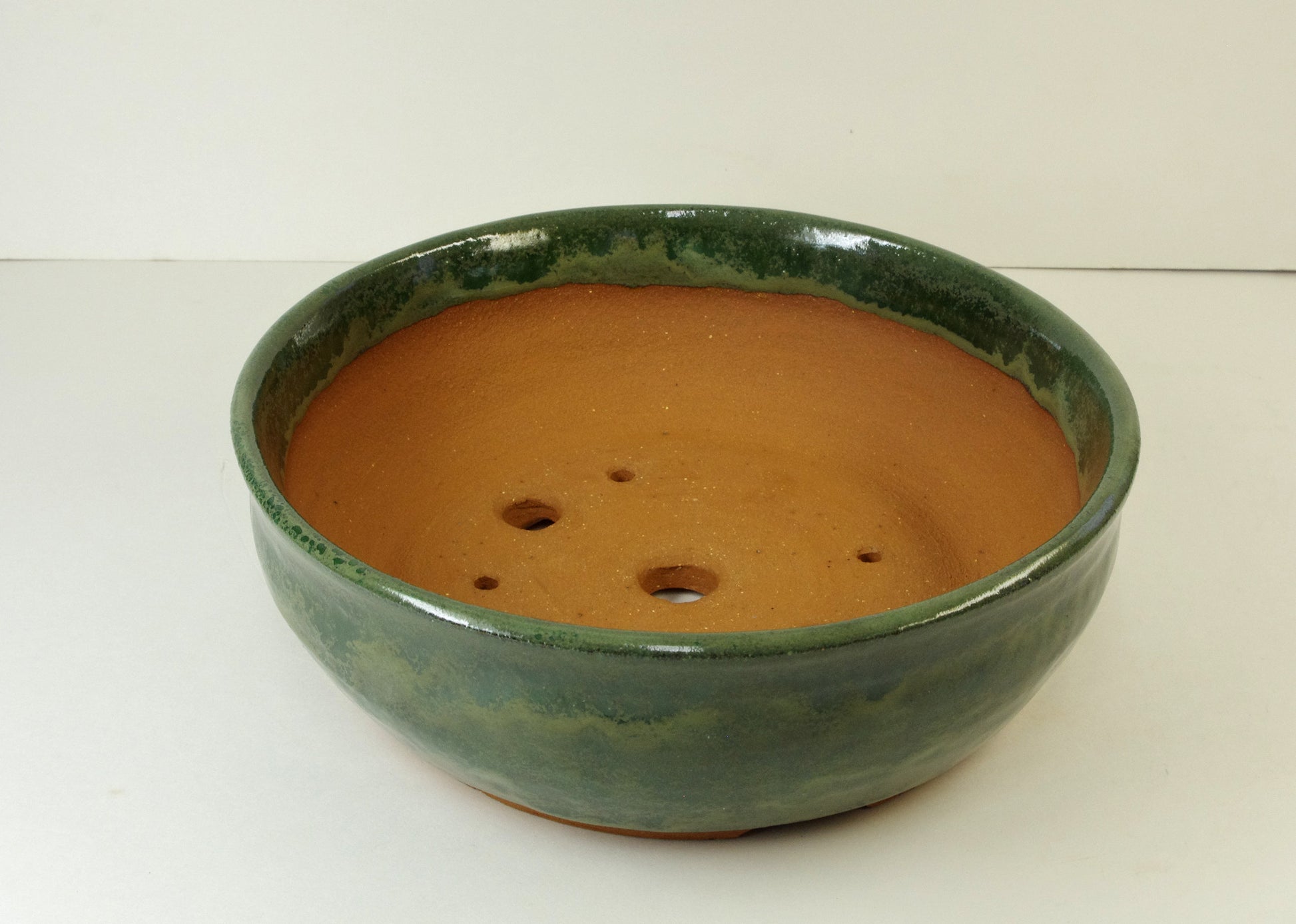 Item 2107, Hand Thrown Stoneware Bonsai Pot, With Extra Wire Holes, 8 x 2 1/2 Greens