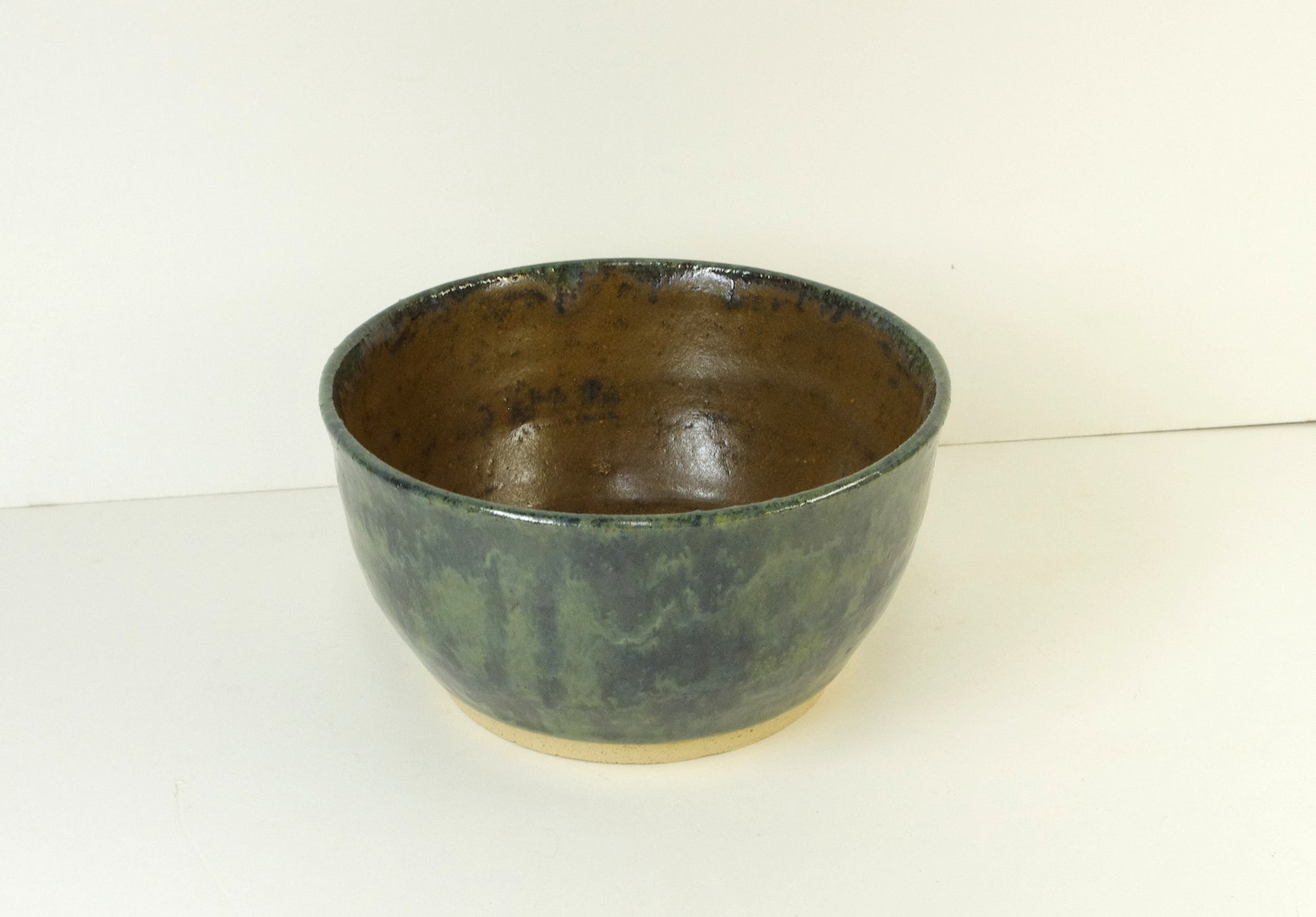 Very small bowl with a gloss glaze of browns on the inside, and greens on the outside.