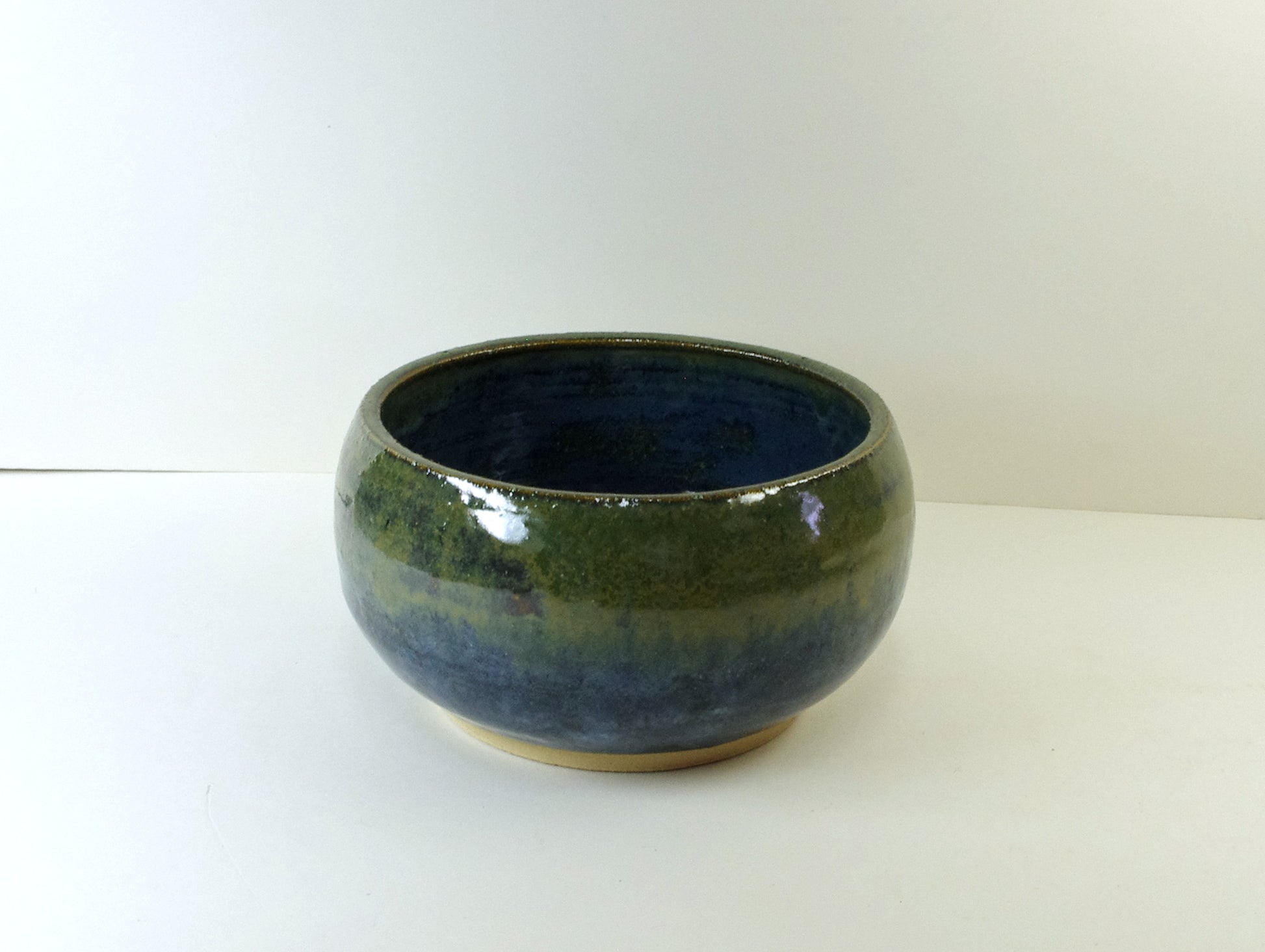 The vase has a gloss glaze of medium olive greens, browns and light, medium and dark blues.