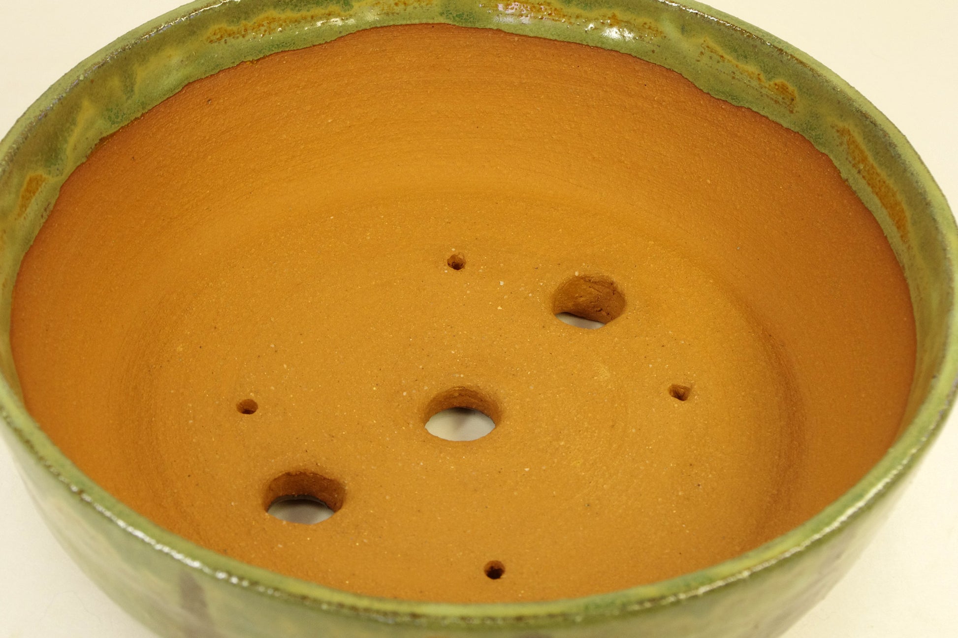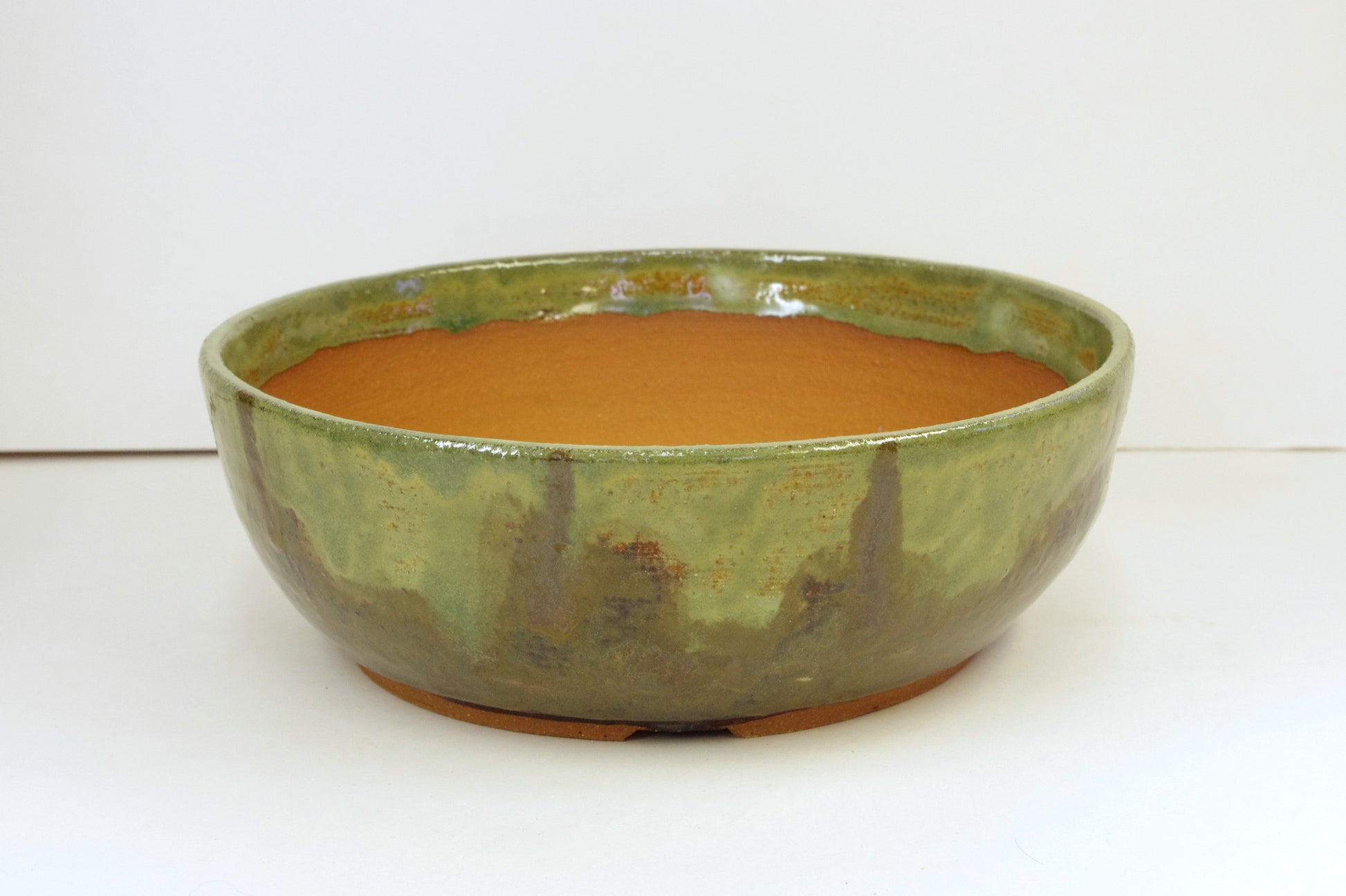 2134 Stoneware Bonsai Pot, Hand Thrown, Browns and Greens 8 1/4 x 2 7/8