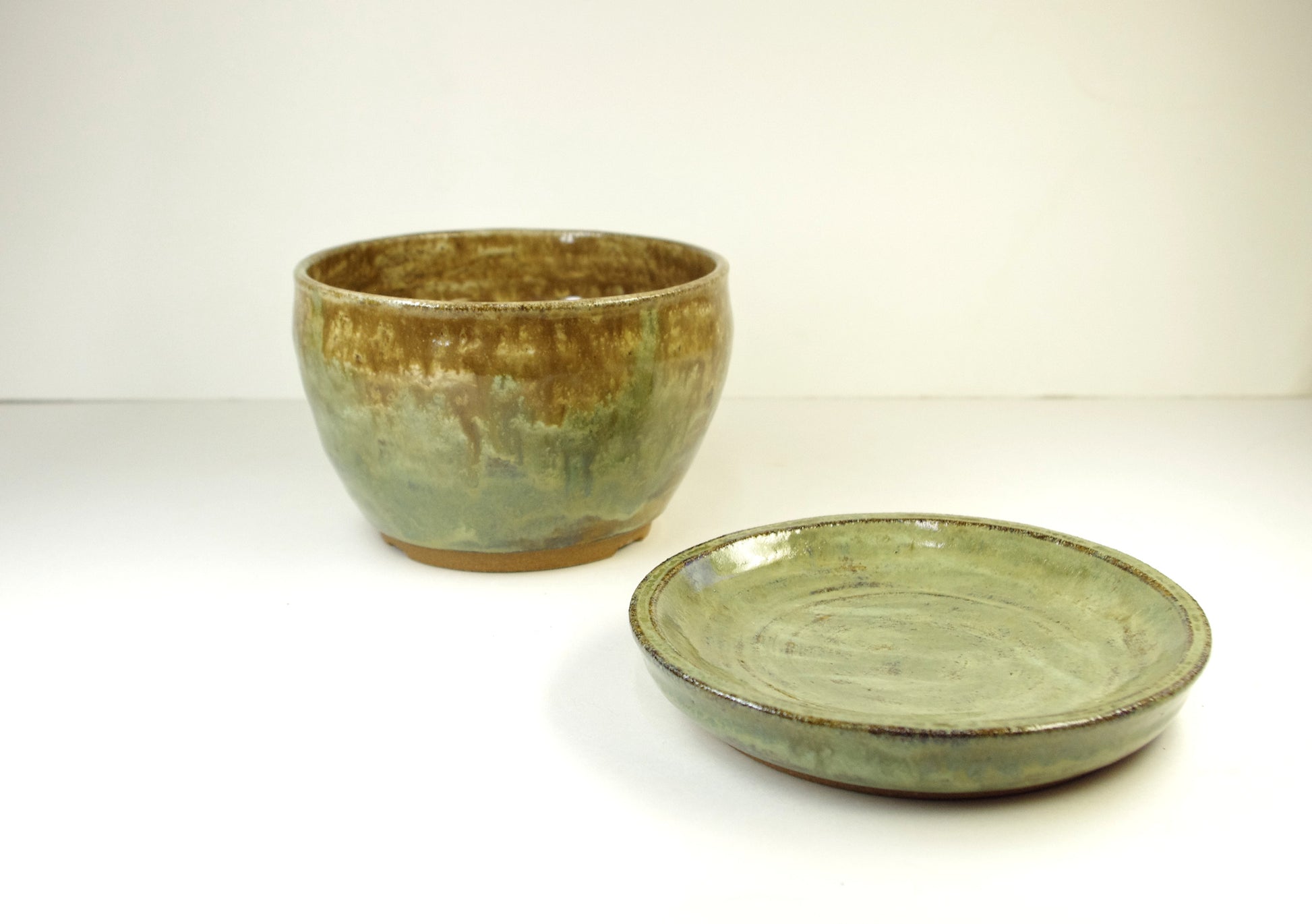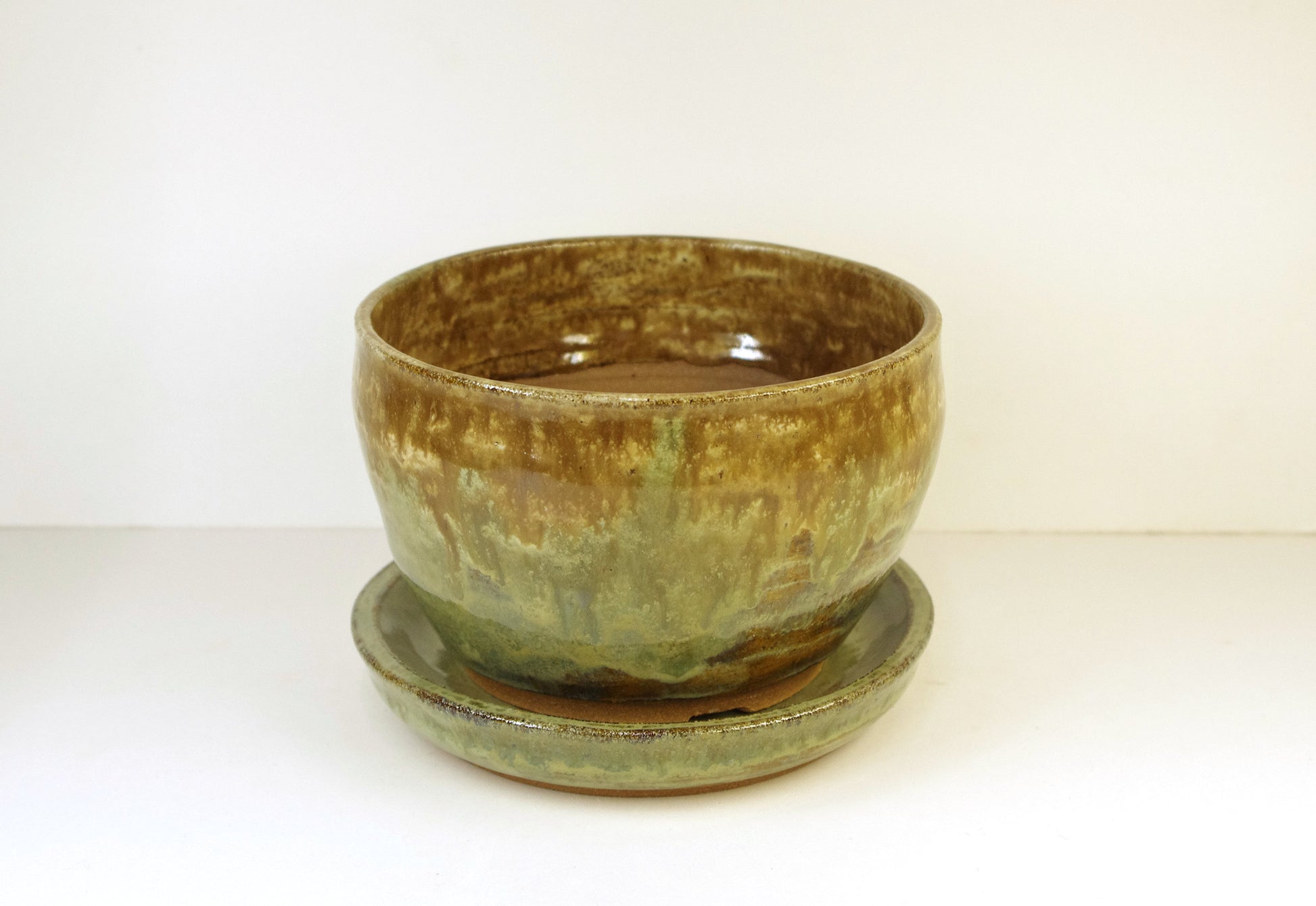 The pot and saucer have a gloss light and medium, and dark greens, tans, beige, and light, medium, and dark browns.