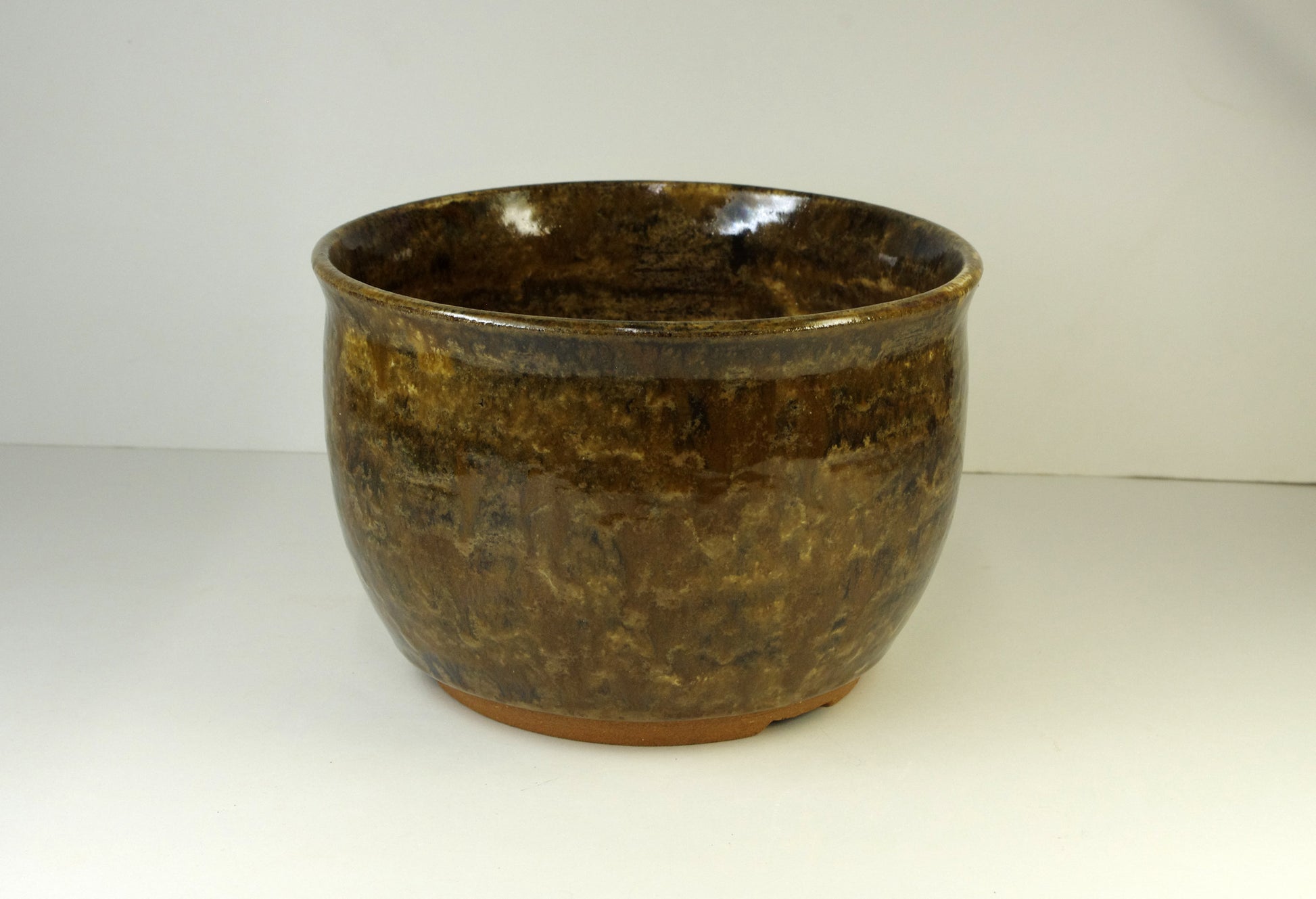 The pot has a gloss glaze of light, medium, and dark browns, with some white.