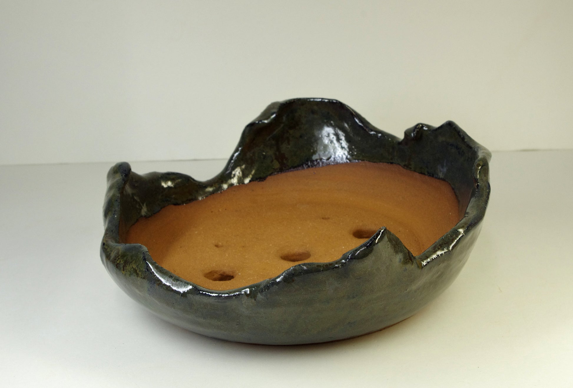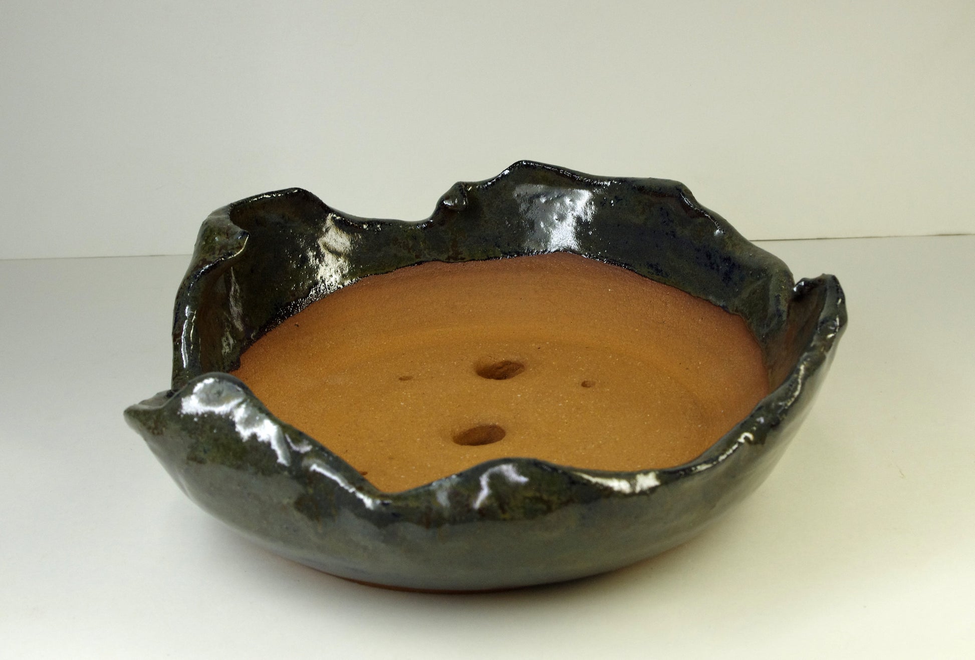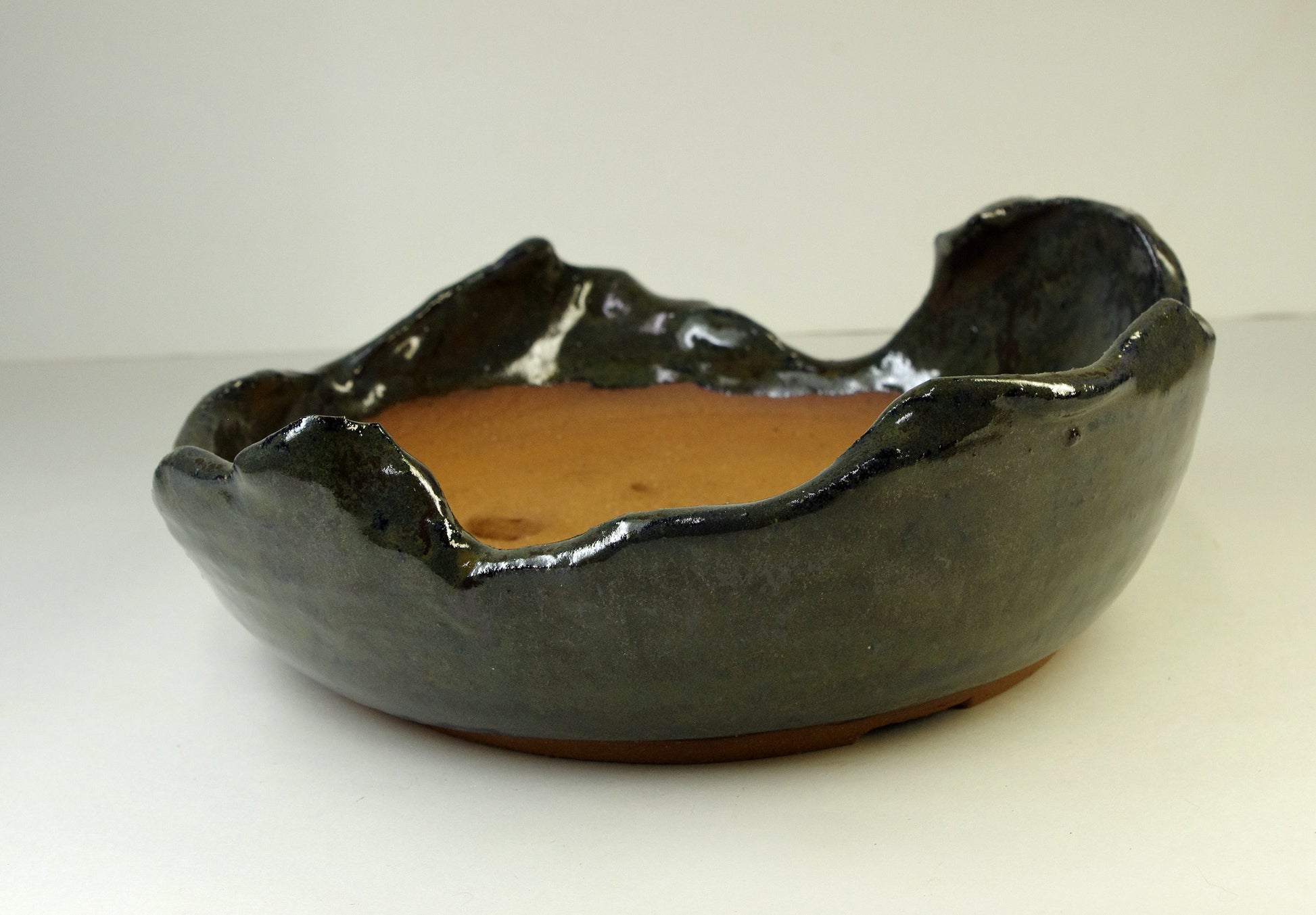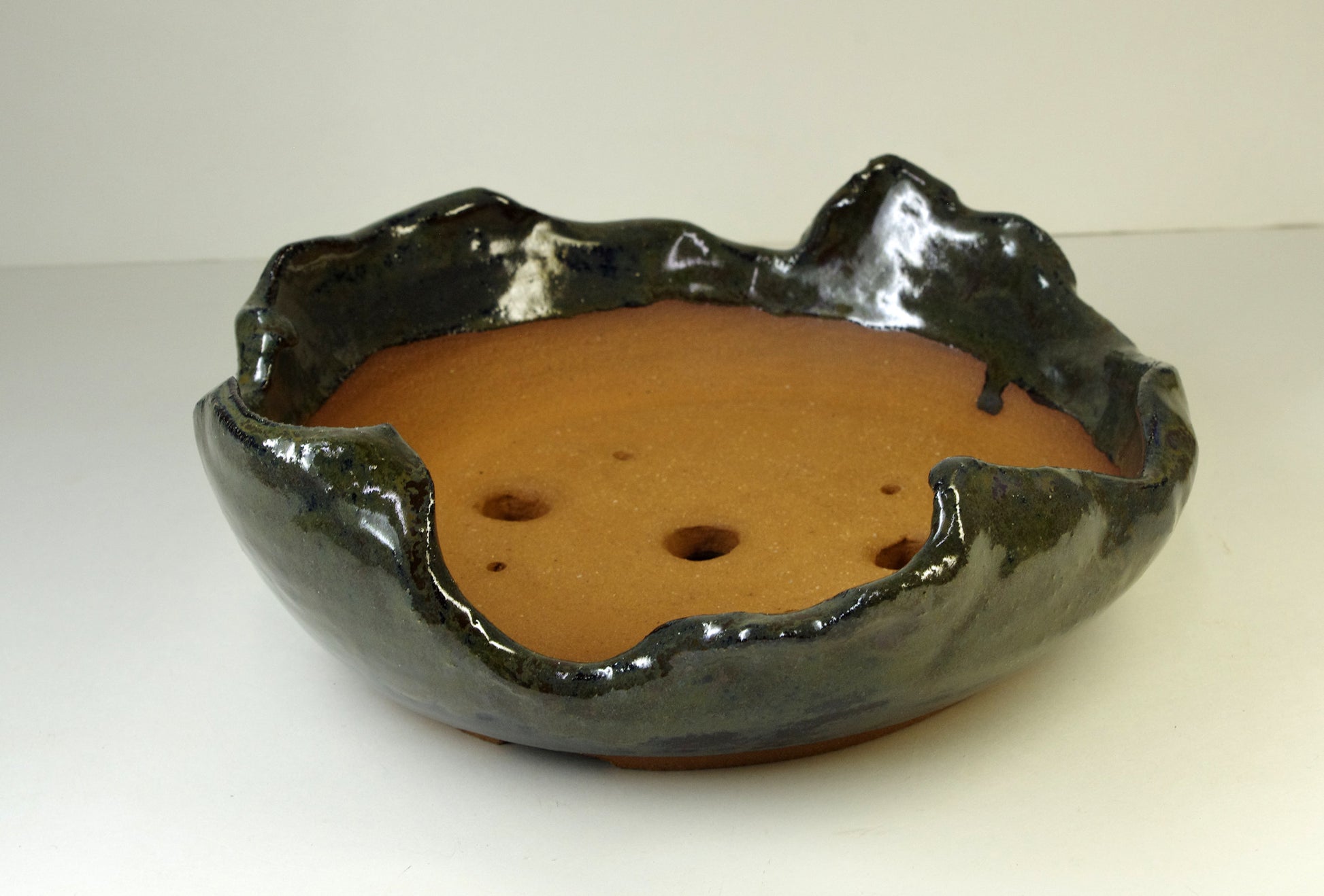 Item 2150, Hand Thrown and Altered Stoneware Bonsai Pot, Dark Grayed Blue, Dark Olive Browns
