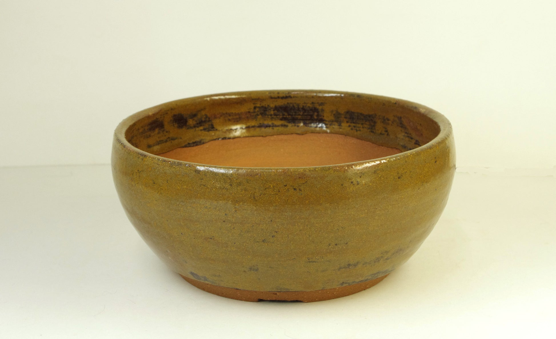 Item 2163, Hand Thrown Stoneware Bonsai Pot with a gloss glaze of dark, and medium browns, and golds.