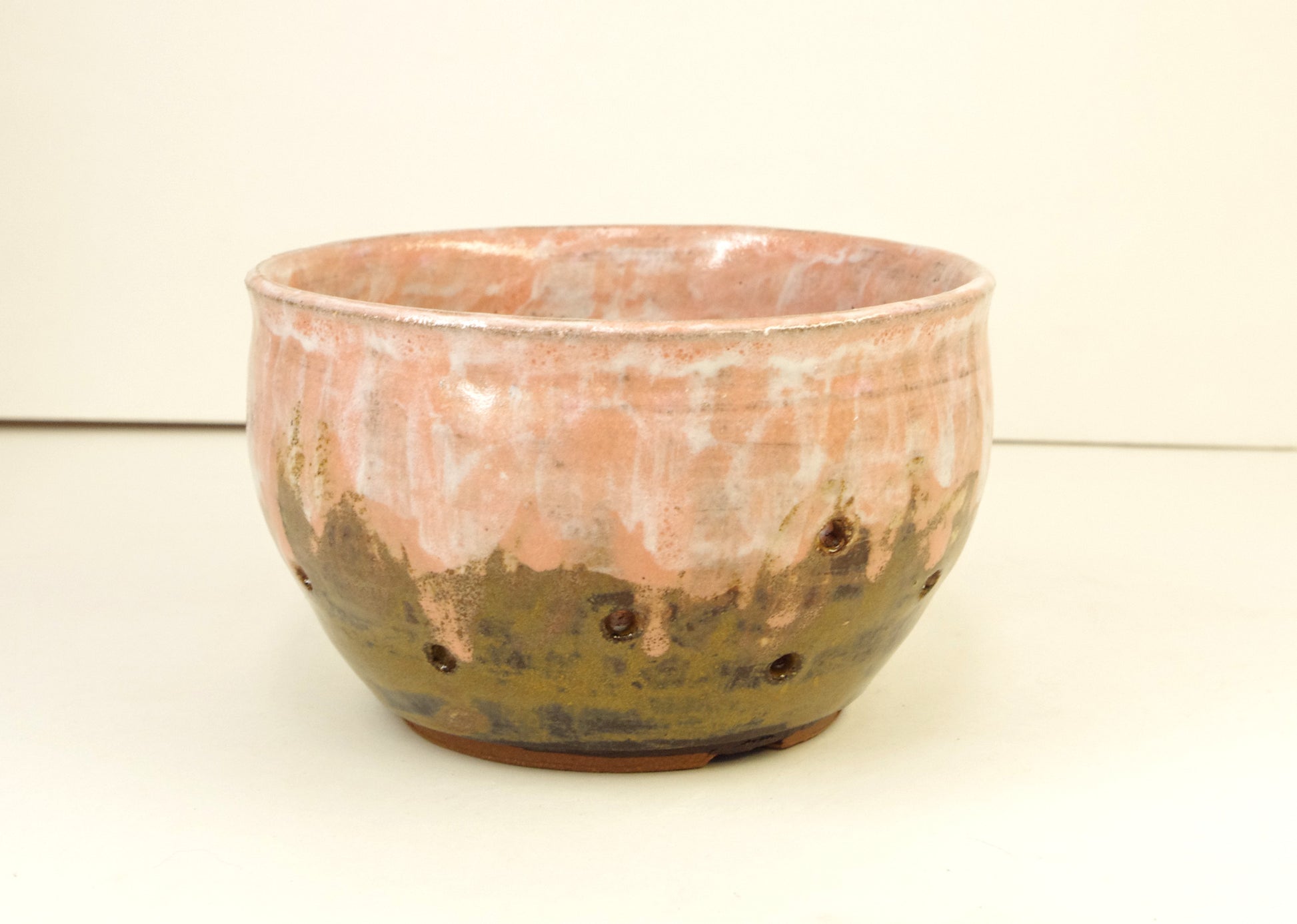 Hand Thrown Stoneware Orchid Pot with a glaze of medium, light, and dark browns, golds, pinks, and white. The orchid pot has ample 1/8 inch air holes.